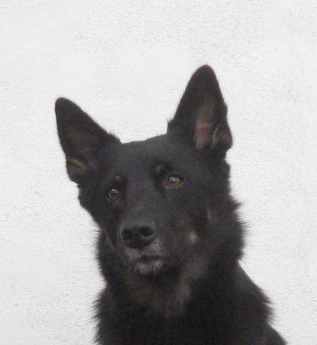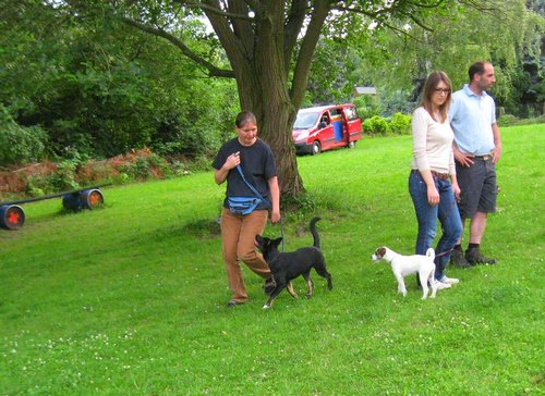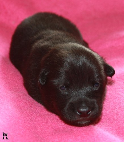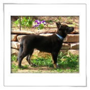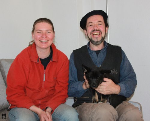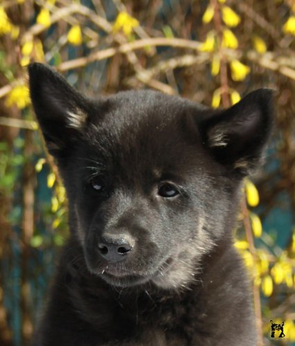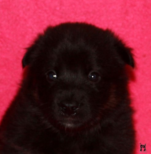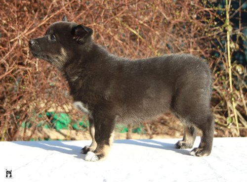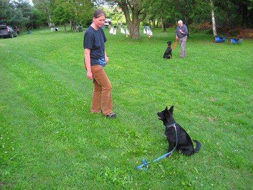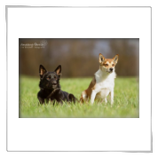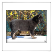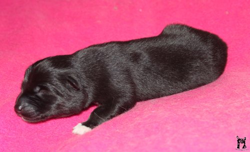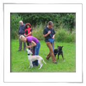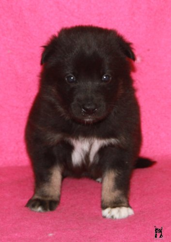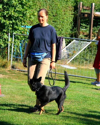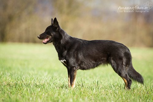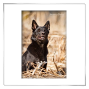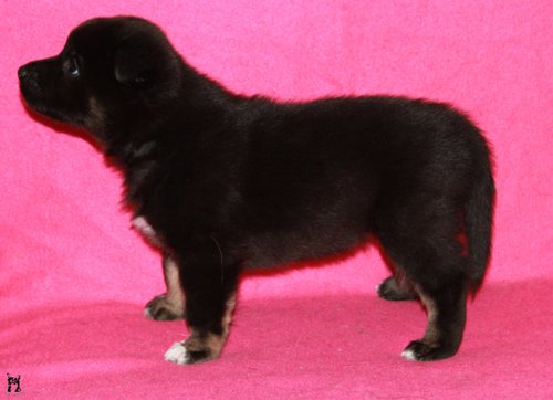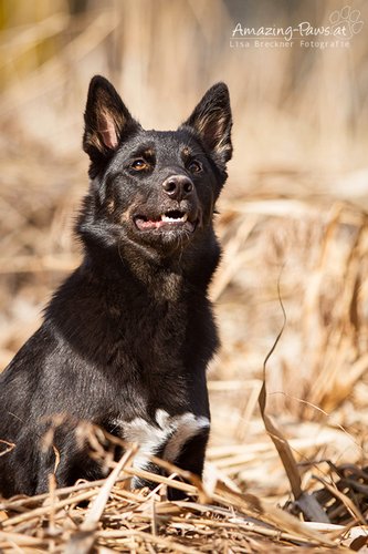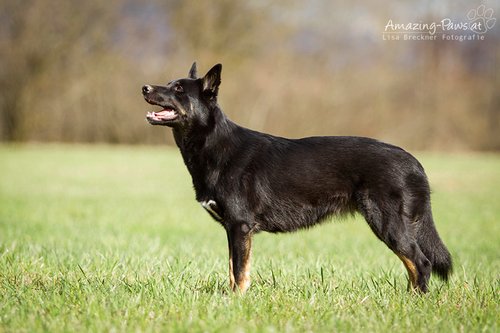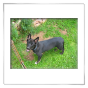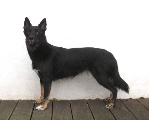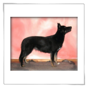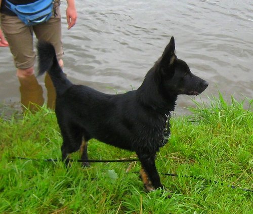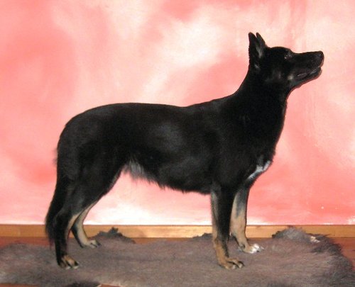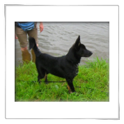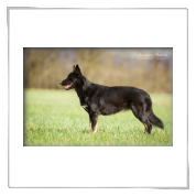 Insgesamt etwas feine Hündin, mit schmalem Kopf, Korrekte Oberlinie, Rute wird deutlich hoch geschwungen, korrekte Winkelung, in der Bewegung fehlt noch Harmonie, etwas vorsichtig aber freundlich