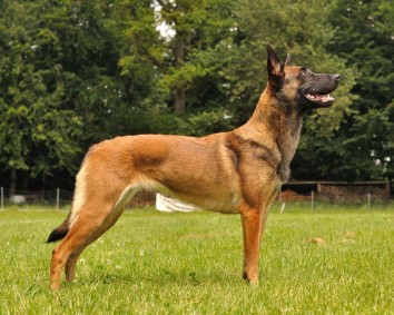 GAIT / MOVEMENT: Lively and free movement at all gaits; the Belgian Shepherd is a good galloper but its normal gaits are the walk and especially the trot; limbs move parallel to the median plane of the body. At high speed the feet come nearer to the median plane; at the trot the reach is medium, the movement even and easy, with good rear drive, and the topline remains tight while the front legs are not lifted too high. Always on the move, the Belgian Shepherd seems tireless; its gait is fast, springy and lively. It is capable of suddenly changing direction at full speed. Due to its exuberant character and its desire to guard and protect, it has a definite tendency to move in circles.